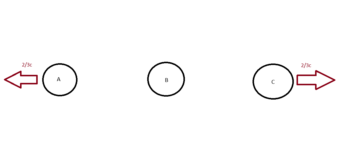 이 그림은 우주에서, B행성의 사람들은 자신들의 시야를 가리는 A행성과 C행성이 마음에 들지 않았습니다. 결국 그들은 하면 안 되는 행동을 했습니다 : 자신들을 기준으로 A행성을 c/2의 속력으로 밀어냈고, C행성을 c/2의 속력으로 A와 반대 방향으로 밀어낸 것입니다!