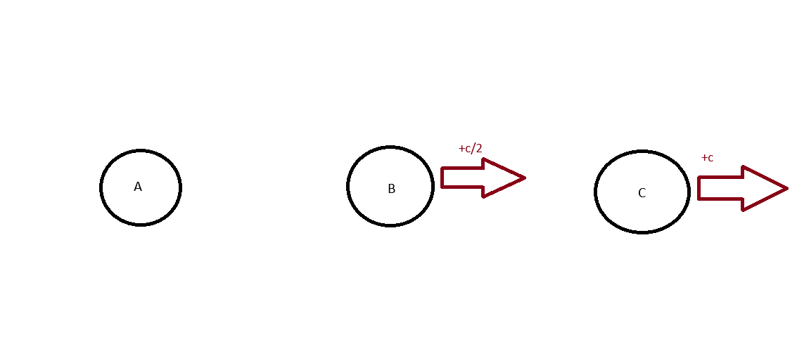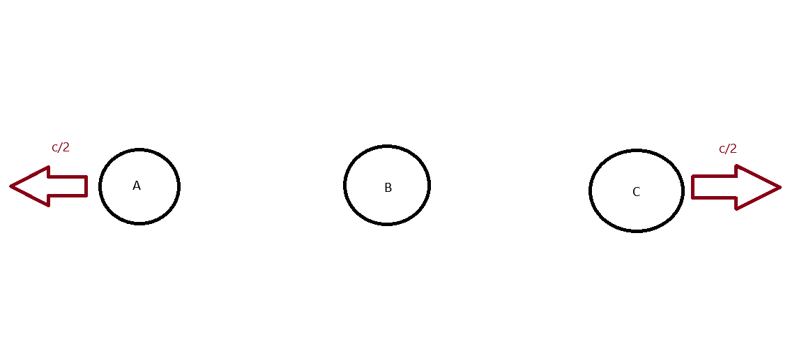 B행성의 사람은 A행성과 C행성이 각각 -c/2, +c/2의 속도를 갖는다고 인식합니다.(오른쪽 방향을 +라 가정했을 때)