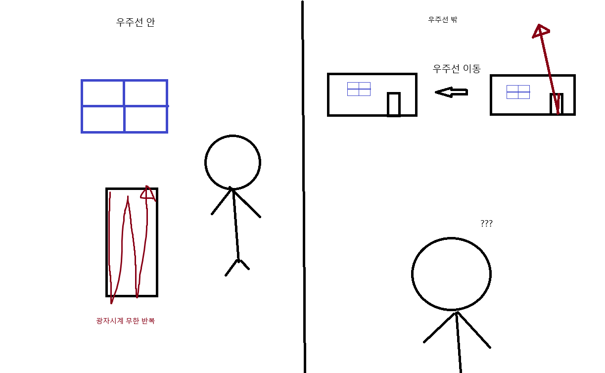 하지만 우주선 밖이라면 결과가 달라집니다. 우주선 밖 사람이 보기엔 우주선과 별개로 빛은 잔상이 남듯이 그 자리에서 한번 반사됩니다. 우주선의 움직임이 파동의 빛을 왼쪽으로 이동시키진 않으니까요.(우주선이 빛을 끌고가지 않으니까요) 빛 입장에선 반사되고 보니 이미 우주선은 왼쪽으로 이동하여 빛은 거울을 만나지 못합니다. 반사율 100퍼센트의 거울이 의미가 사라졌습니다. 참고로 그림에선 약간 왼쪽으로 나가도록 그렸는데 사실 우주선 수직 위로 나갑니다.