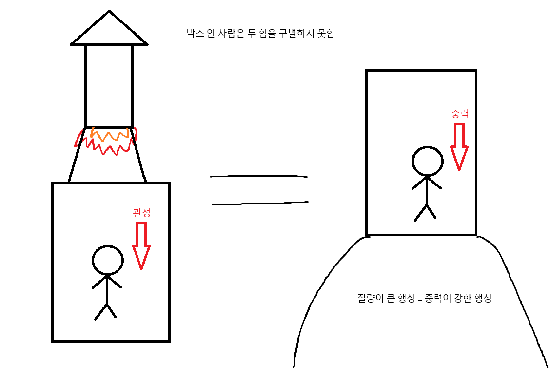 그리고 이 두힘(관성과 중력)중 어떤 힘인지 박스 안 사람에게 물어본다면 구별할 수 없을 것입니다.