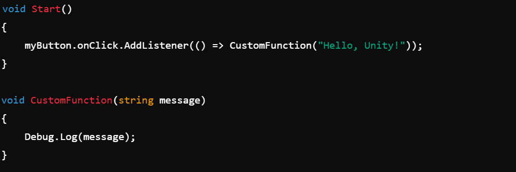 UnityEvent의 기본 동작은 매개변수가 없는 함수를 호출하지만, 매개변수가 필요한 경우 익명 함수를 활용할 수 있습니다.