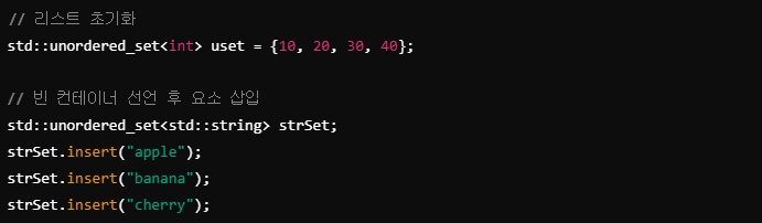 - 해시 테이블 기반: 요소를 해시 테이블에 저장하며, 삽입/삭제/탐색의 평균 시간 복잡도는 **O(1)**입니다.