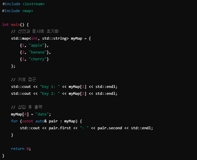 - 자동 정렬: 기본적으로 std::map은 키를 자동으로 정렬합니다. 기본 정렬은 오름차순이며, 사용자가 정의한 비교 함수에 따라 정렬을 변경할 수 있습니다.