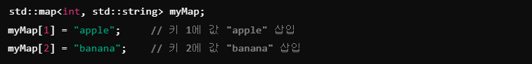 insert | 키와 값을 삽입합니다. 이미 존재하는 키는 삽입되지 않습니다. | 삽입이 성공하면 std::pair<iterator, bool> 반환 (삽입 여부와 iterator) |