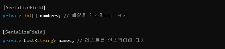 - 직렬화 가능한 데이터만 인스펙터 창에 표시됩니다. (예: int, float, string, Unity의 GameObject, Transform 등)