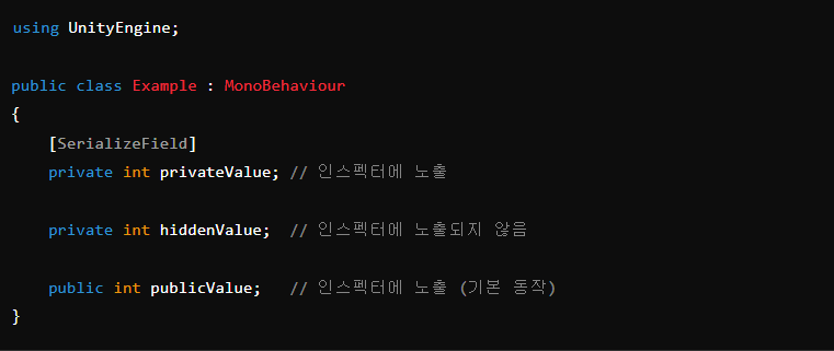 - [SerializeField]는 private 필드에만 사용하는 것이 일반적입니다. public 필드는 기본적으로 직렬화되므로 굳이 사용할 필요가 없습니다.