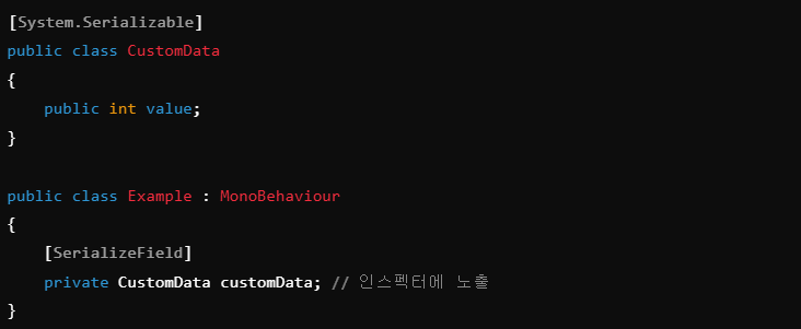 - Unity에서 직렬화되지 않는 클래스(예: 사용자 정의 클래스)는 [System.Serializable] 어트리뷰트를 함께 사용해야 합니다.