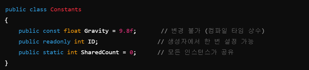 readonly | 런타임 상수: 선언 시 또는 생성자에서 값 설정 가능, 이후 변경 불가. |